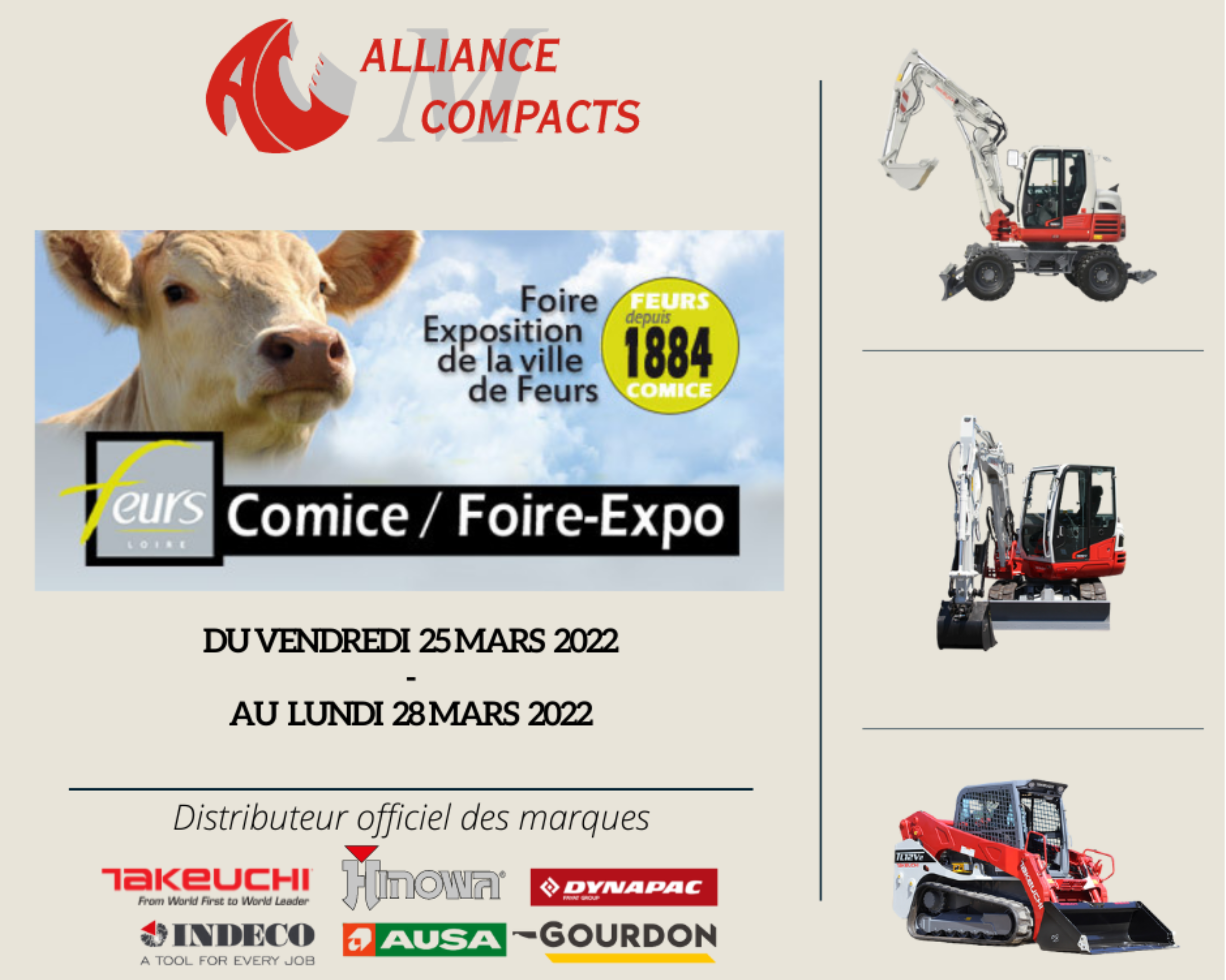 Le groupe Alliance Compacts sera présent à Feurs du vendredi 25 mars au lundi 28 mars 2022. Notre équipe sera à votre écoute pour vous accompagner et répondre à toutes vos questions. Au programme une présentation de la gamme Takeuchi, de la mini pelle à notre 15 tonnes en passant par notre pelle à pneus, vous saurez tout à propos de l'entreprise créatrice de la mini pelle. Venez également découvrir nos compacteurs Dynapac, nos dumpers Ausa, nos remorques Gourdon ou encore nos BRH Indeco. Venez découvrir l'ensemble de notre gamme pour répondre à toutes vos questions.