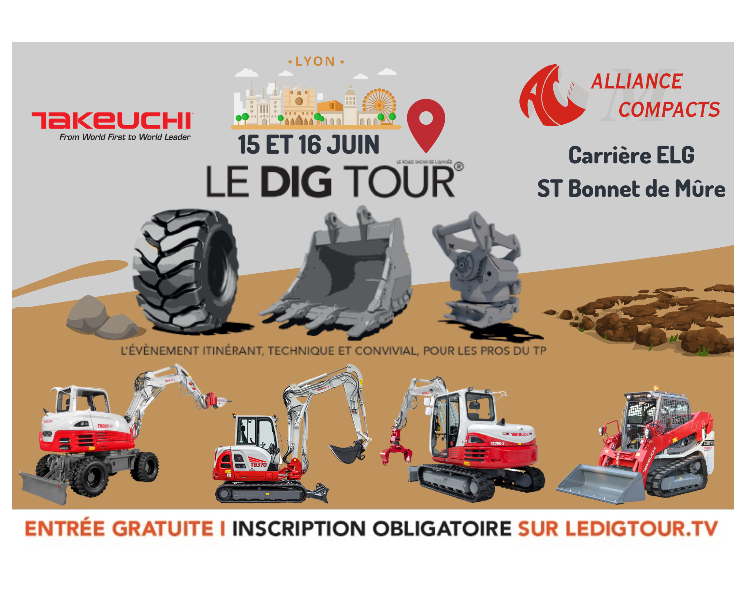 Le Groupe Alliance Compacts vous attend nombreux pour le DIG TOUR du 15 au 16 juin 2023 à la carrière ELG de Saint-Bonnet-de-Mure (69), sur le Stand de l'entreprise TAKEUCHI.