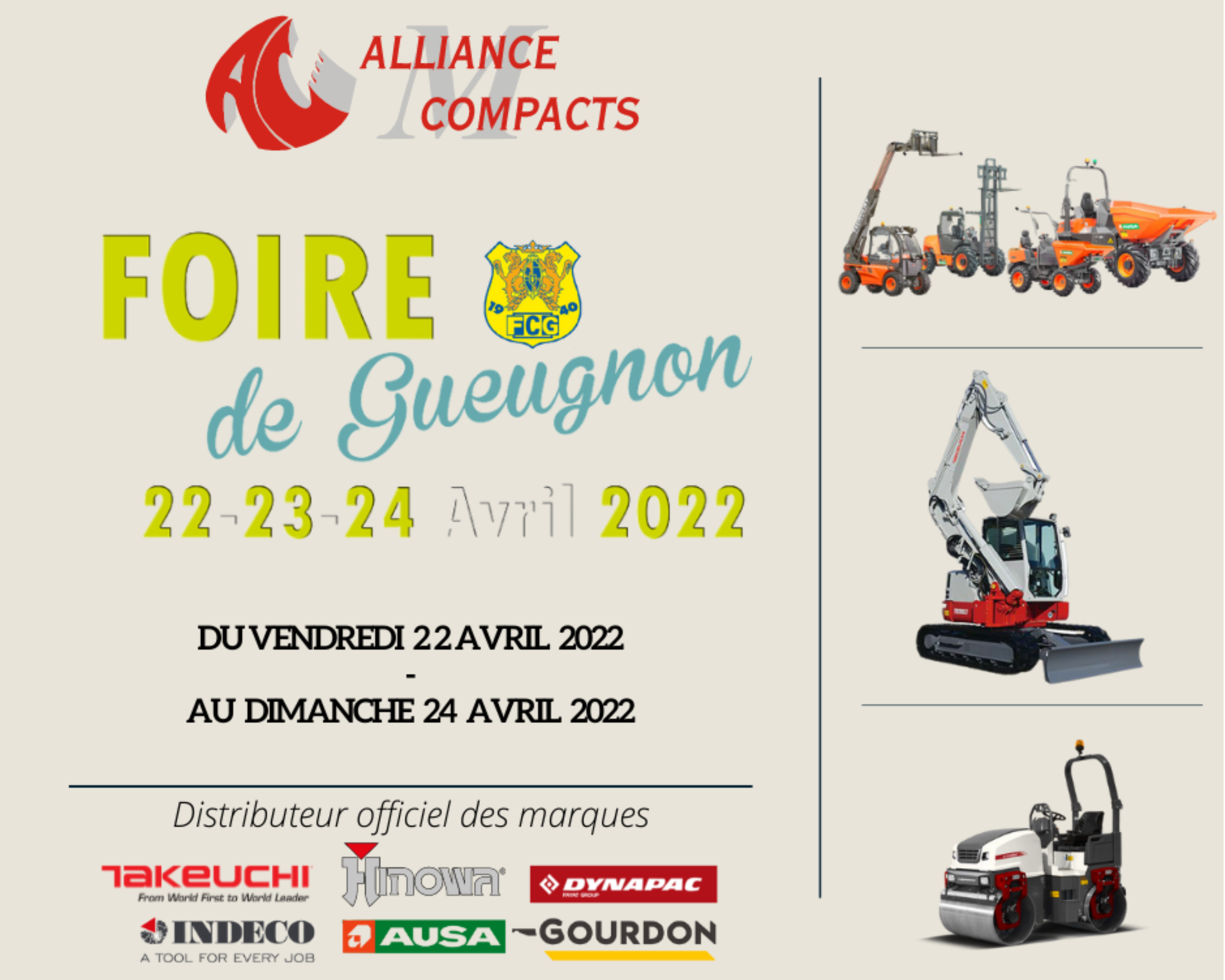 Le groupe Alliance Compacts sera présent à Gueugnon du vendredi 22 avril au dimanche 24 avril 2022. Notre équipe sera à votre écoute pour vous accompagner et répondre à toutes vos questions. Au programme une présentation de la gamme Takeuchi, de la mini pelle à notre 15 tonnes en passant par notre pelle à pneus, vous saurez tout à propos de l'entreprise créatrice de la mini pelle. Venez également découvrir nos compacteurs Dynapac, nos dumpers Ausa, nos remorques Gourdon ou encore nos BRH Indeco. Venez découvrir l'ensemble de notre gamme pour répondre à toutes vos besoins.