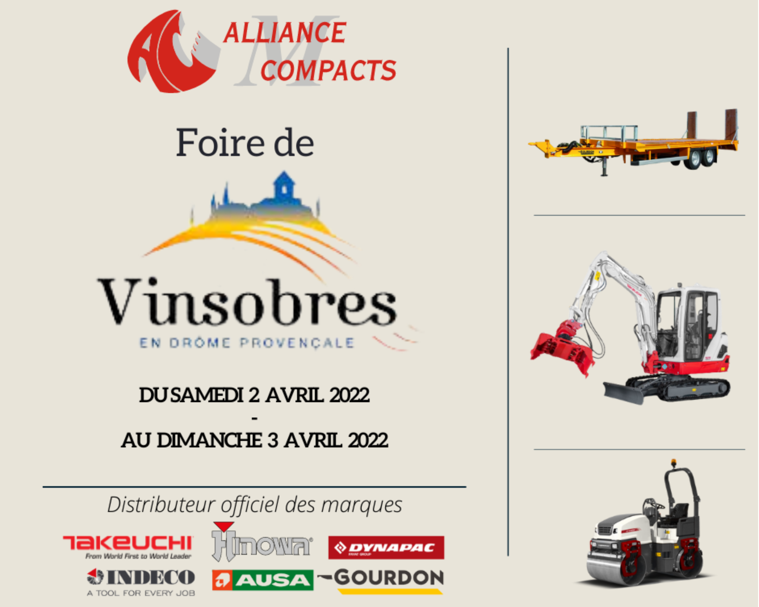 Le groupe Alliance Compacts sera présent à Vinsobres du samedi 2 avril au dimanche 3 avril 2022. Notre équipe sera à votre écoute pour vous accompagner et répondre à toutes vos questions. Au programme une présentation de la gamme Takeuchi, de la mini pelle à notre 15 tonnes en passant par notre pelle à pneus, vous saurez tout à propos de l'entreprise créatrice de la mini pelle. Venez également découvrir nos compacteurs Dynapac, nos dumpers Ausa, nos remorques Gourdon ou encore nos BRH Indeco. Venez découvrir l'ensemble de notre gamme pour répondre à toutes vos besoins.